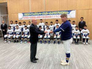 中学軟式野球クラブ「刈羽ウイングベースボールクラブ」が、10月11日~12日に行われた第17回全日本少年春季軟式野球大会新潟県予選大会兼第21回オンヨネカップ~新潟県中学生新人野球大会~で初優勝し、見事全国大会の切符を手にしました。選手たちが市役所で市長表敬訪問後、本間敏博会長が激励金を手渡しました。令和8年3月20日~25日(岡山県倉敷スポーツ公園マスカットスタジアム)に行われる全国大会に出場します。創部5年目にしてチーム目標の「全国大会出場」を達成されました。