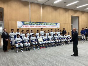 中学軟式野球クラブ「刈羽ウイングベースボールクラブ」が、10月11日~12日に行われた第17回全日本少年春季軟式野球大会新潟県予選大会兼第21回オンヨネカップ~新潟県中学生新人野球大会~で初優勝し、見事全国大会の切符を手にしました。選手たちが市役所で市長表敬訪問後、本間敏博会長が激励金を手渡しました。令和8年3月20日~25日(岡山県倉敷スポーツ公園マスカットスタジアム)に行われる全国大会に出場します。創部5年目にしてチーム目標の「全国大会出場」を達成されました。